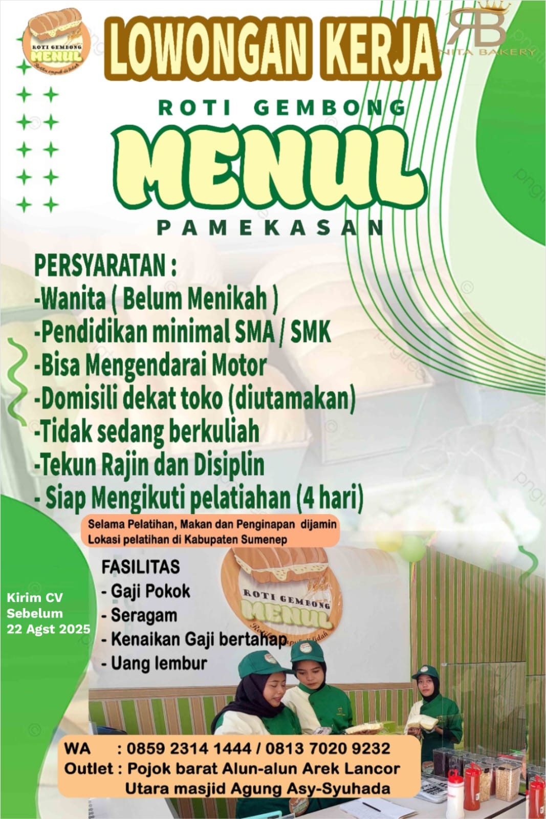 Dalam pengumuman resmi yang diterima Netranews.co.id, Senin (4/8/2025), Roti Gembong Menul mencari kandidat perempuan yang belum menikah dan berdomisili dekat outlet, yang berlokasi di pojok barat Alun-alun Arek Lancor, utara Masjid Agung Asy-Syuhada, Pamekasan.